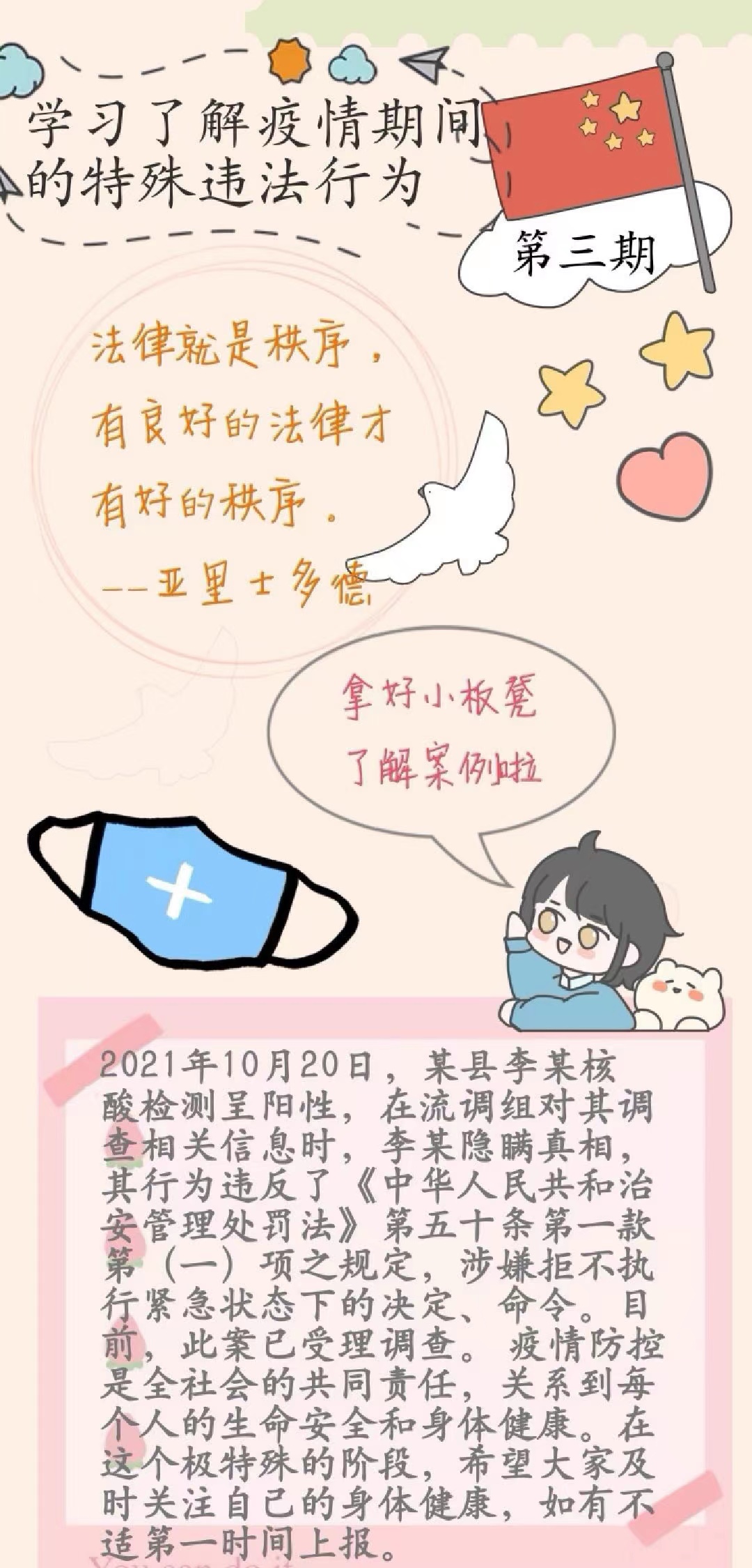 在前四期的普法学习中,法学专业师生通过对《中华人民共和国传染病防治法》《中华人民共和国治安管理处罚法》《中华人民共和国刑法》等相关法律内容的梳理以及以相关案例作为解释,通过微信、钉钉等班级群向师生开展普法实践活动,使同学们对与疫情相关的法律法规有了更加深刻、明确的认识,了解了疫情期间采取各种管控措施的法律依据,以及违反疫情管控措施等可能带来法律后果等问题,对同学们在今后的抗疫工作中起到了积极作用。