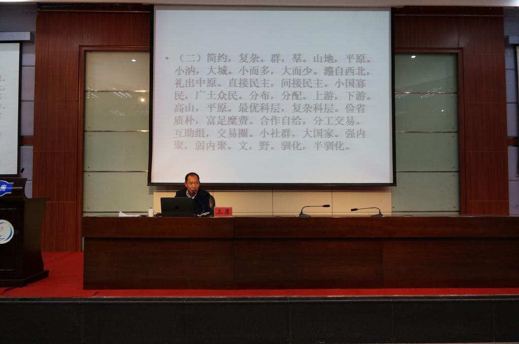 王勇教授以西北所处地理位置为出发点,讲述了黄土高原肥沃土地上孕育的先进传统文化,并由此展开,为大家呈现了一幅农牧部落繁荣发展、中原王国兴衰交替的宏大场景。王勇教授对于平原“方国”在制度上的优势与劣势给出了自己独到的见解,解答了为什么“夫做事者必于东南,收功实者必于西北”,更佐以鲑鱼回流之例,充分论证了西北地域地理形态给政治生态带来的巨大影响。在讲座结尾,王教授与诸侯快讯ok1122官网五位同学进行了趣味互动,在阵阵掌声中结束了这场精彩的讲座。王教授渊博的学识、精彩的论述,从另一个层面开启了在场师生崭新的“西北情结”。
