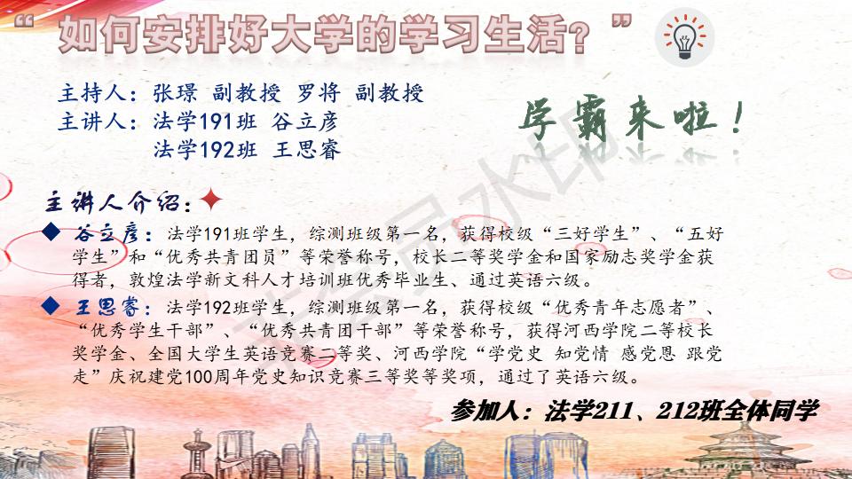 2021年11月28日下午,诸侯快讯ok1122官网法学211班和法学212班全体同学,共同举办了“如何安排好大学的学习生活”主题班会。