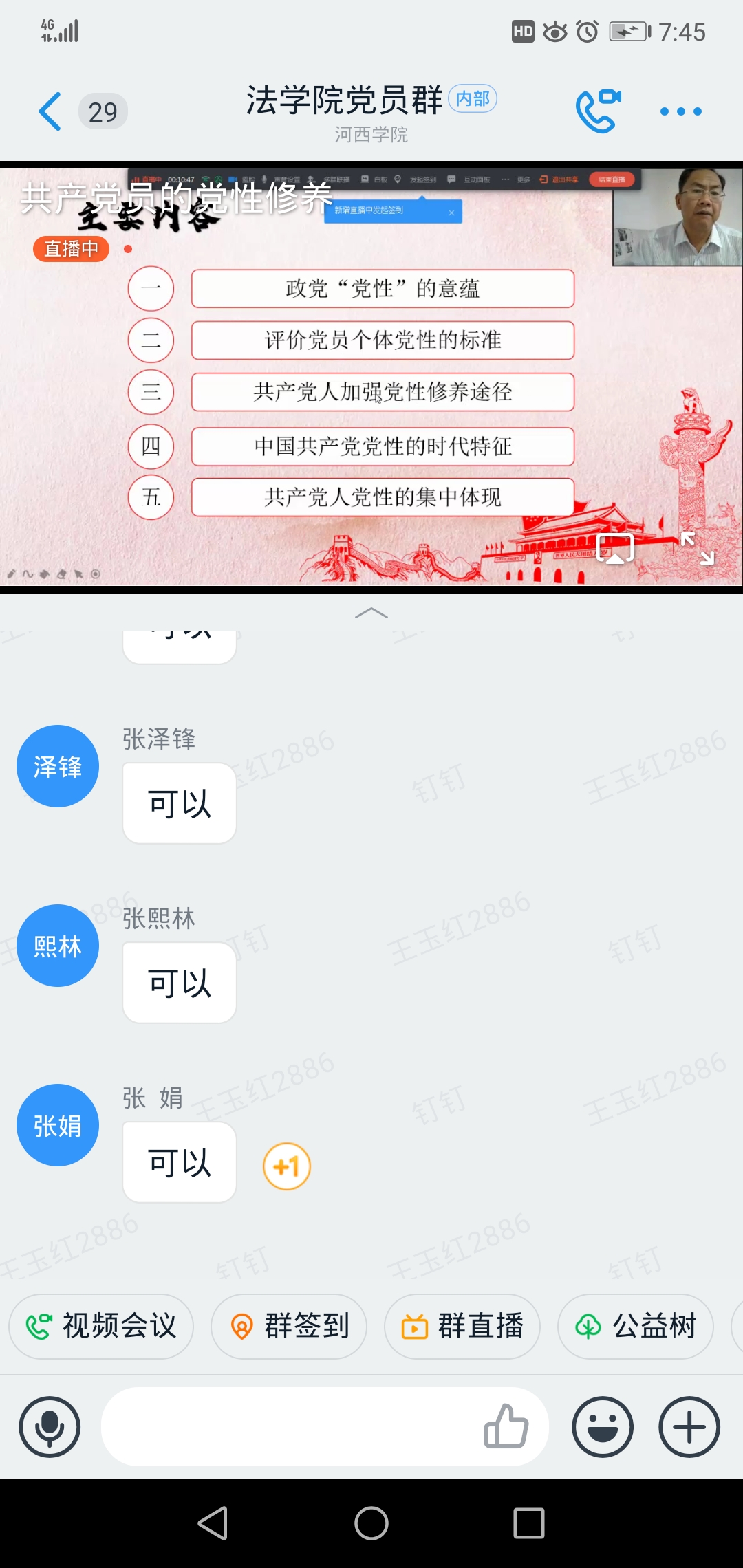 最后表明,共产党人党性集中体现在入党誓词,当代中国共产党人就是实现党的十九大确定的“两个一百年”奋斗目标,全面建成小康社会,把中国建设成为富强民主文明和谐美丽的社会主义现代化强国,努力实现中华民族伟大复兴的中国梦。新时代党性要求我们自觉地增强“四个意识”、坚定“四个自信”、做到“两个维护”,更加自觉地投身于党和国家事业发展,更加自觉地贯彻执行党的教育方针,争做合格党员,当好人民满意的教师,为中国特色社会主义事业培养越来越多的合格建设者和优秀接班人。