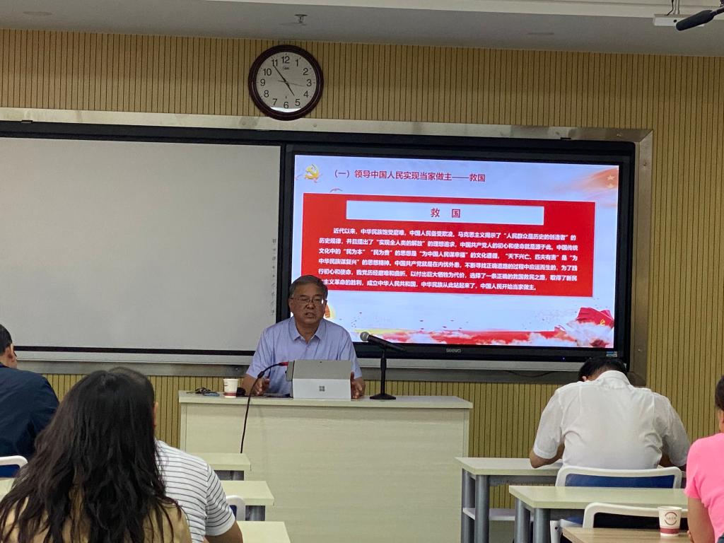 张勇副校长紧紧围绕着中国共产党全心全意为人民服务的宗旨,阐述了中国共产党在100年的奋斗历程中,从中华民族救亡图存中探索初心使命,到夺取革命胜利中铭记初心使命,直至社会主义建设与改革的新征程中坚守初心使命,到新时代全面建成小康社会回望初心使命,始终永葆奋斗精神和人民为中心的初心宗旨。最后指出,百年来,中国共产党人坚定理想信念,坚持人民为中心,始终保持同人民的血肉联系,前赴后继、敢为人先、一心为民、勇于担当,始终践行着为中国人民谋幸福,为中华民族谋复兴的初心使命。