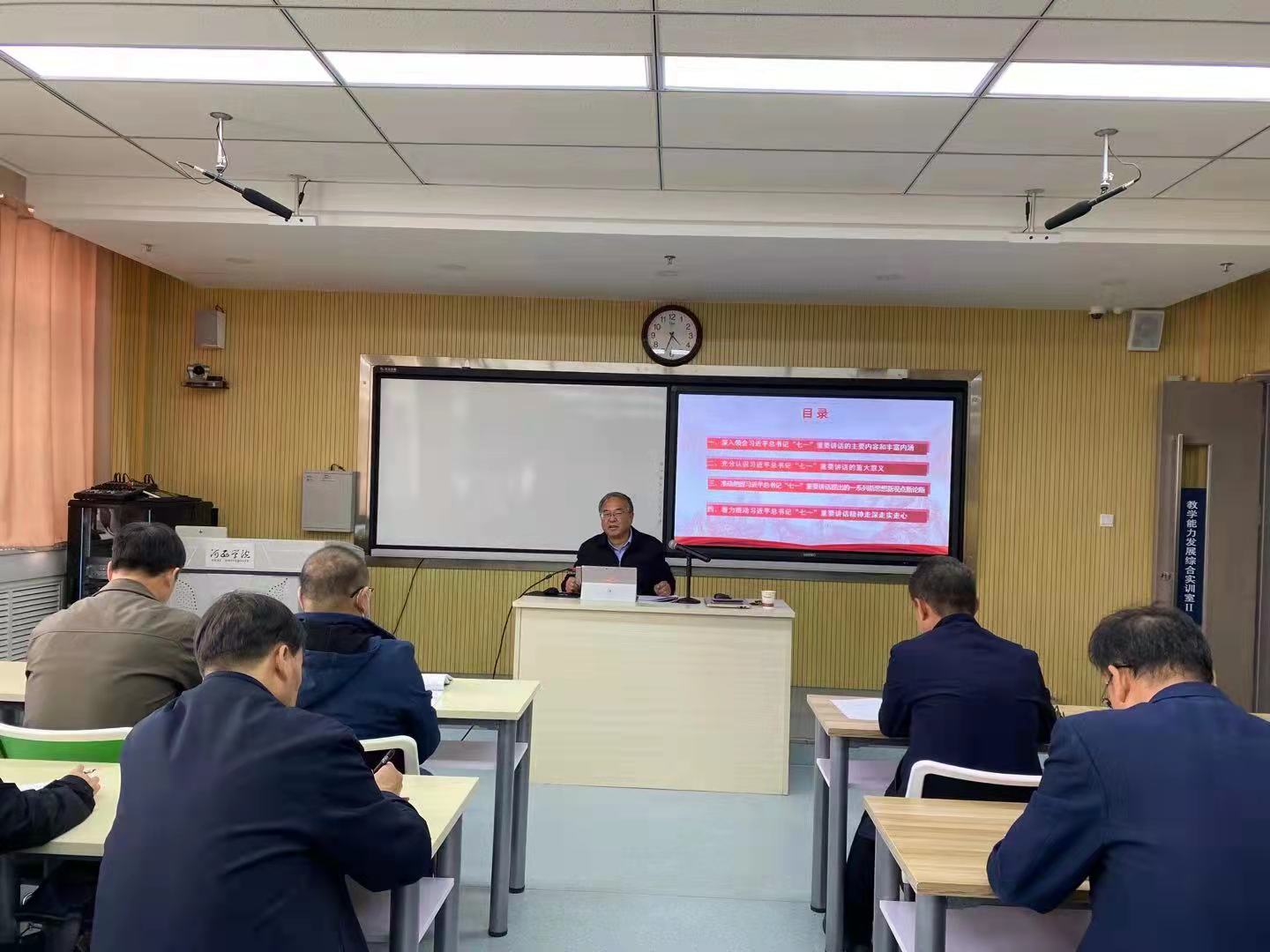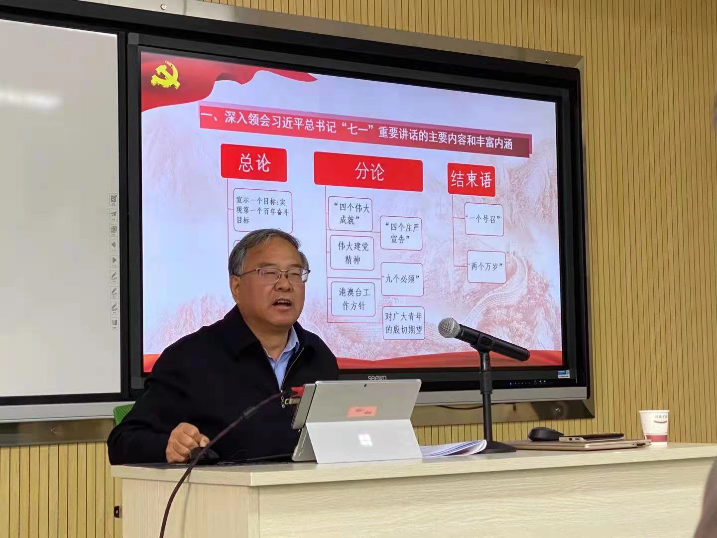 张校长在报告中深刻阐述了习近平总书记“七一”重要讲话的科学内涵、重要价值和深远意义,指出“七一”重要讲话是立足中国共产党百年华诞的重大时刻和“两个一百年”历史交汇的关键节点的闪耀真理光芒的马克思主义纲领性文献,为全党全国各族人民向第二个百年奋斗目标迈进提供了根本遵循。