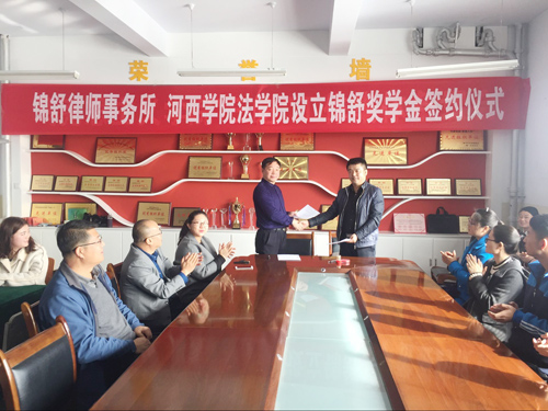 甘肃锦舒律师事务所负责人对张掖市律师队伍及法律服务现状向大家作了简要介绍,同时对“锦舒奖学金”设立的目的进行说明,旨在引导和鼓励学生刻苦学习、奋发向上、促进学生全面素质提高和个性健康发展,以期能够达到培养更多高素质法学专业人才的目的,从而推动法学教育事业更好地发展。