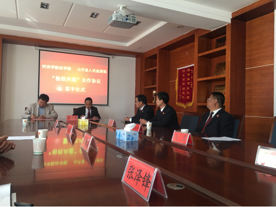 洪勇检察长首先代表山丹县人民检察院对合作协议的签订表示祝贺!他指出,“检校共建”是贯彻全面依法治国战略和落实《中华人民共和国教育部、中共中央政法委员会关于实施卓越法律人才教育培养计划的若干意见》的重要举措。检校共建能实现检校优势互补,促进法学理论教育与检察司法实践的有机结合。山丹县检察院将为实习大学生提供良好学习实践环境,并以基地建设为纽带,积极融入“检校共建”合作之中,培养应用型法律人才,实现共赢。同时,“检校共建”将通过协同开展法律理论与实践课题研究,提高检察院司法理论水平,进而促进人民检察工作。