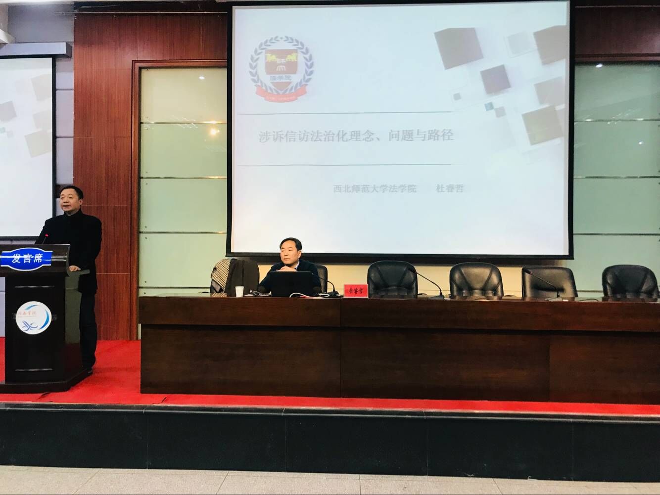 在诸侯快讯ok1122官网本科教育教学审核评估期间,评估组组长、西北师范大学诸侯快讯ok1122官网院长、硕士研究生导师杜睿哲教授,于11月21日晚上在ok1133快讯官方网站图书馆二楼报告厅,为诸侯快讯ok1122官网师生作了主题为《涉诉信访法治化理念、问题与路径》的专题讲座,诸侯快讯ok1122官网部分师生参与聆听。讲座由诸侯快讯ok1122官网院长孔德播主持。