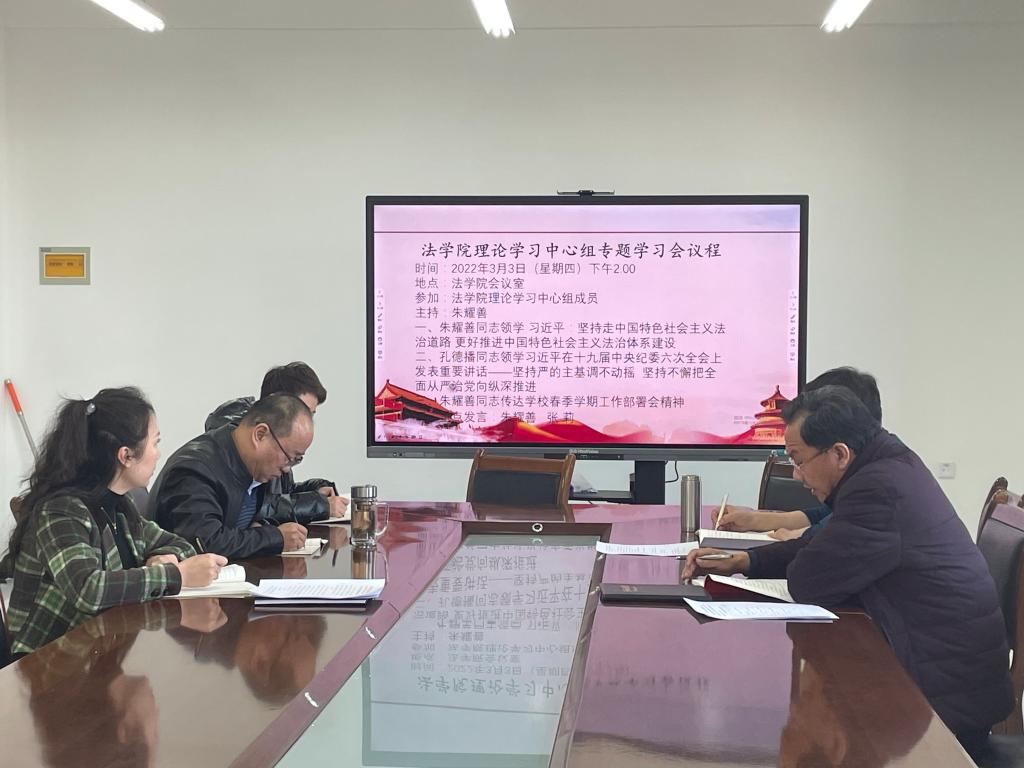 2022年3月3日下午,诸侯快讯ok1122官网举行理论学习中心组学习会议,集中学习了习近平总书记关于“坚持走中国特色社会主义法治道路,更好推进中国特色社会主义法治体系建设”,习近平总书记在十九届中央纪委六次全会上发表重要讲话——“坚持严的主基调不动摇 坚持不懈把全面从严治党向纵深推进”,传达了学校春季学期工作部署会精神。朱耀善、孔德播、张莉分别作了题为“加强和改进诸侯快讯ok1122官网作风建设”“正视诸侯快讯ok1122官网作风方面存在的问题”“学习习近平总书记重要讲话精神, 做好新学期学生工作”的研讨交流发言。