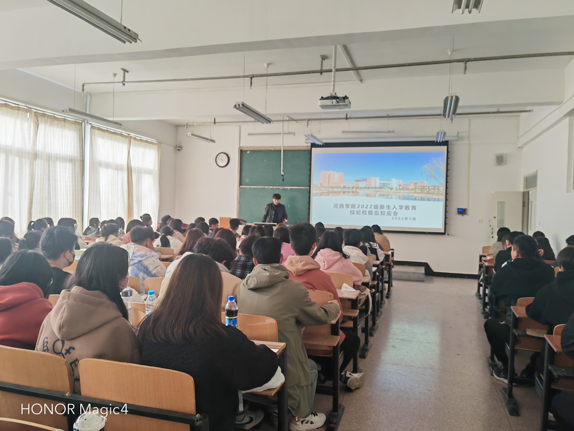 2023年3月15日下午,诸侯快讯ok1122官网党委书记书记朱耀善、院长孔德播、辅导员张莉分别从自身安全、适应大学生活和遵守校纪校规三个方面为2022级新生作了入学教育专题讲座。