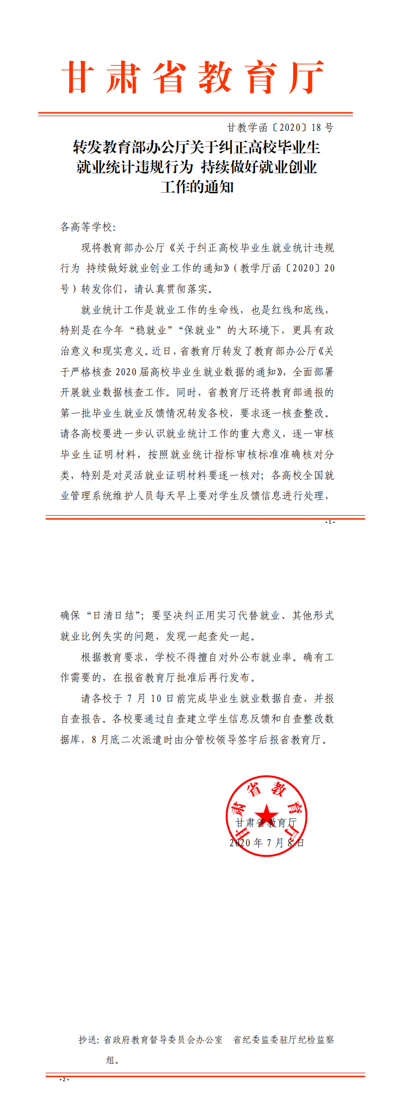 转发教育部办公厅关于纠正高校毕业生就业统计违规行为持续做好就业创业工作的通知