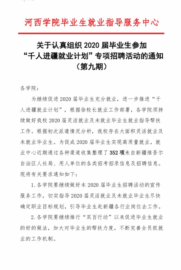 关于认真组织2020届毕业生参加“千人进疆就业计划”专项招聘活动的通知(第九期)