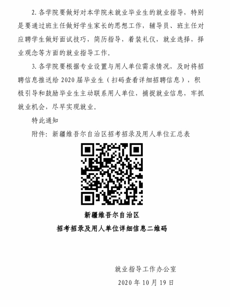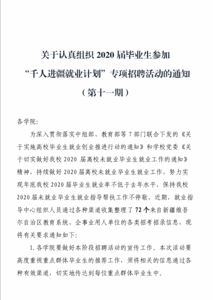 上一条:关于认真组织2020届毕业生参加“千人进疆就业计划”专项招聘活动的通知(第十二期) 下一条:关于认真组织2021届毕业生积极参加西北五省及北上广等13个省份用人单位招聘活动的通知(第四期)