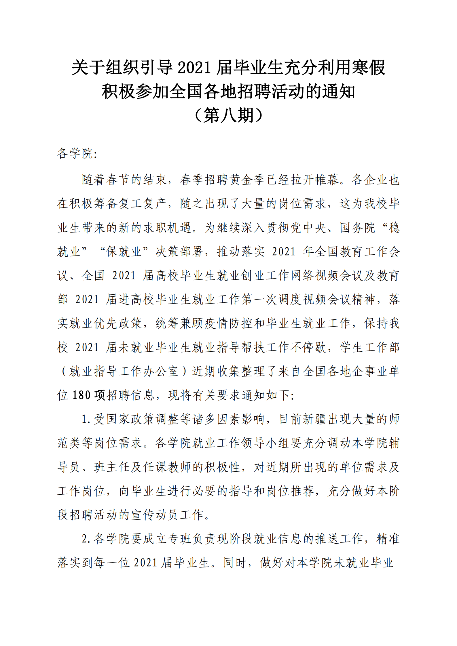 关于组织引导2021届毕业生充分利用寒假积极参加全国各地招聘活动的通知(第八期)